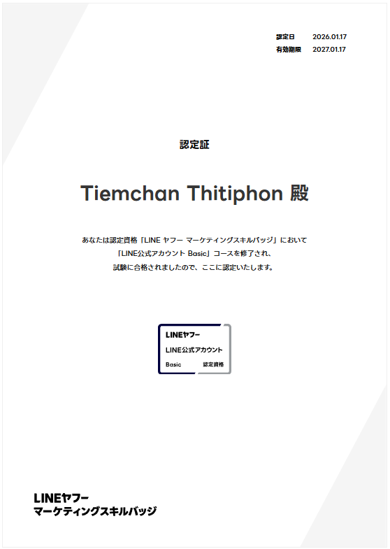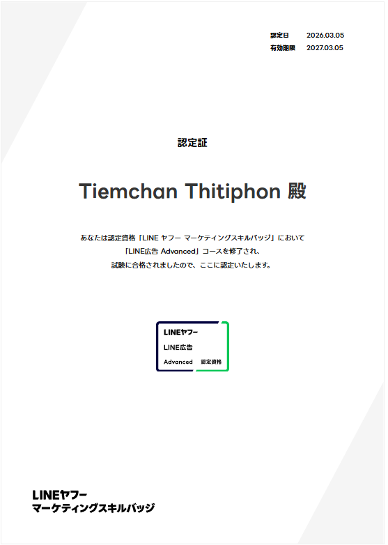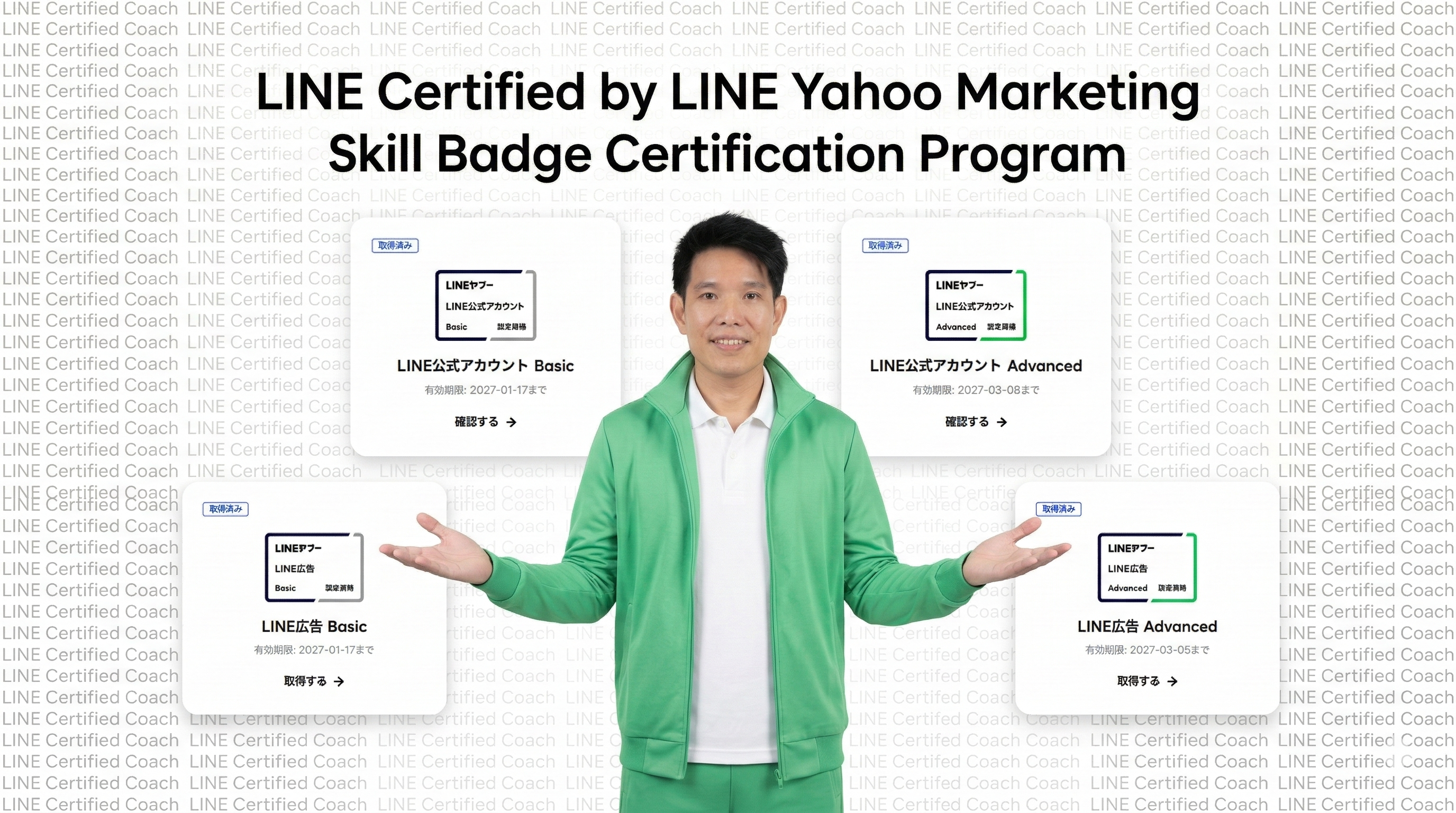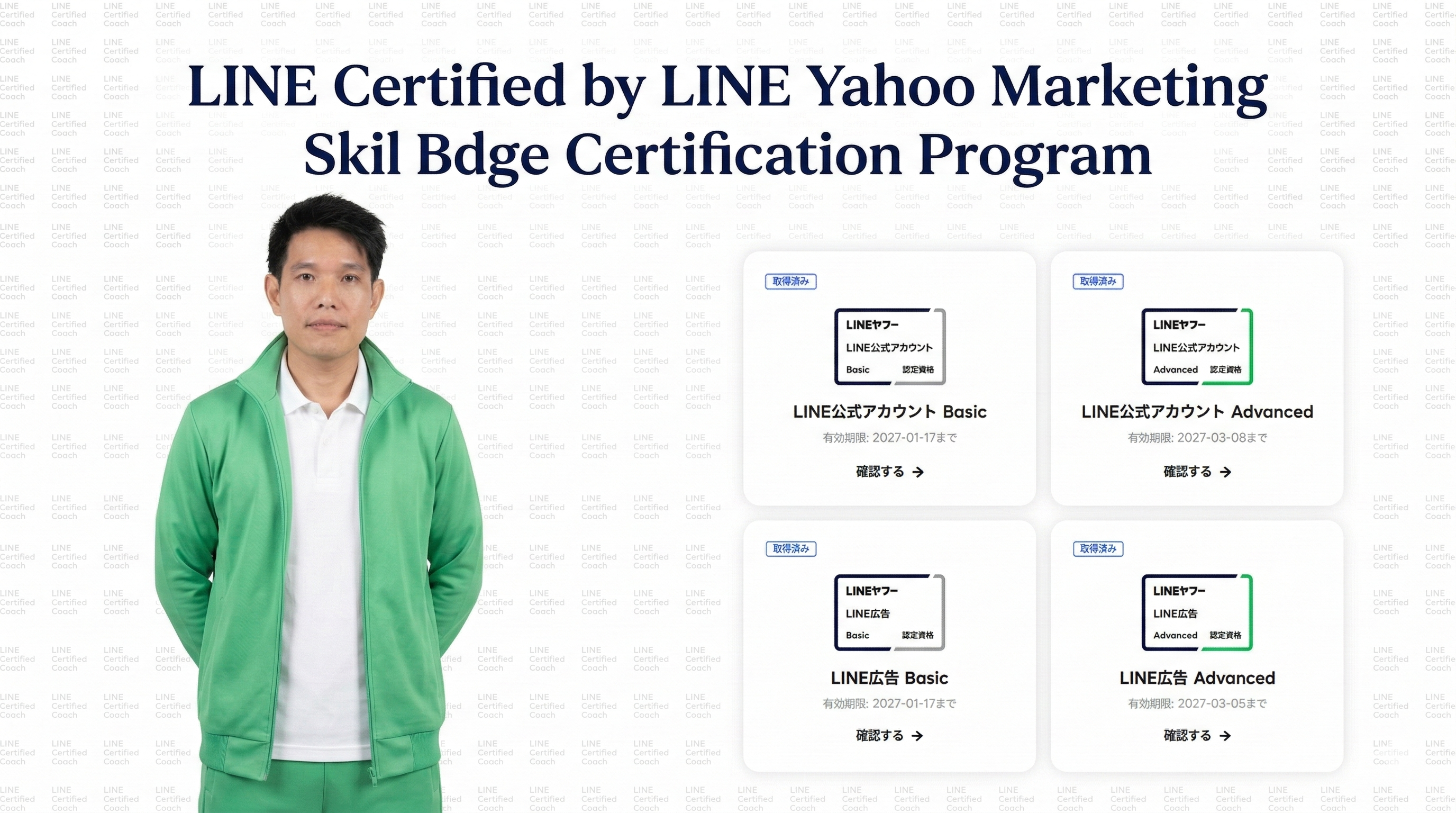 จุดที่ช่วยเสริมความน่าเชื่อถือได้อย่างชัดเจน คือการที่อาจารย์แชมป์ผ่านการรับรองครบ 4 หลักสูตร ในโปรแกรมการรับรองคุณวุฒิ LINE Yahoo Marketing Skill Badge ทั้งฝั่ง LINE Official Account และฝั่ง LINE Ads ครบทั้งระดับ Basic และ Advanced ซึ่งสะท้อนทั้งความเข้าใจพื้นฐานและการใช้งานระดับต่อยอด